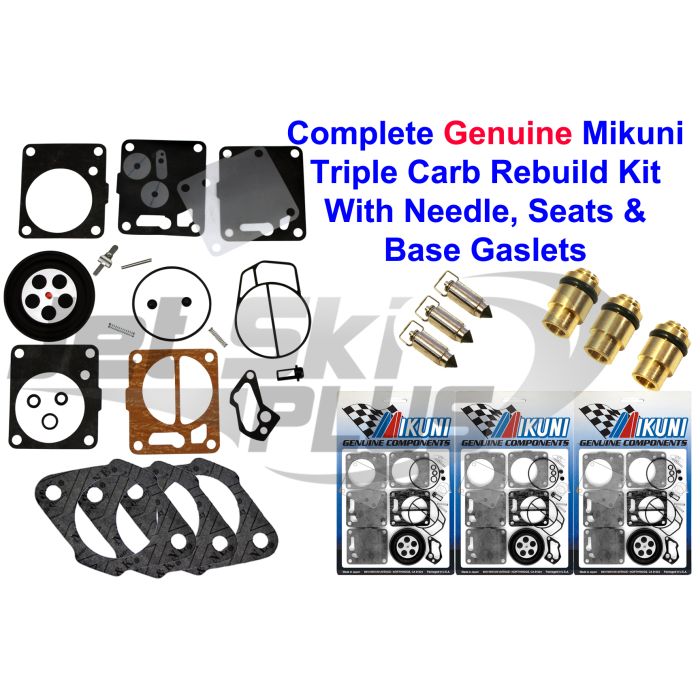 Complete Genuine Mikuni SBNI carburetor rebuild kit with Genuine Mikuni needles & seats and aftermarket base gaskets.