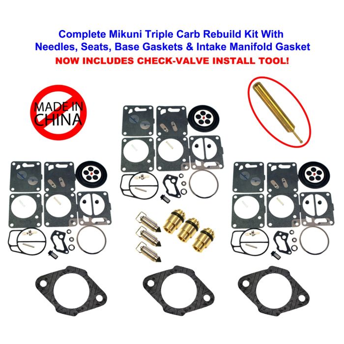 Complete aftermarket Mikuni SBNI carburetor rebuild kit with needles, seats and base gaskets.