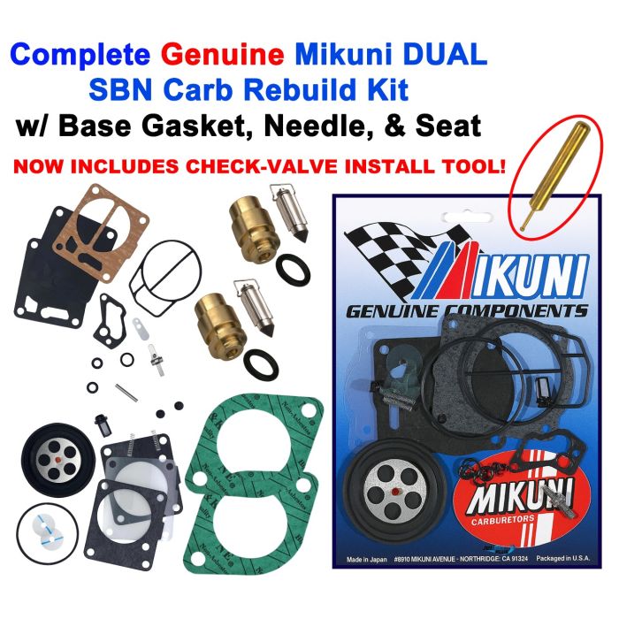 Genuine Mikuni complete DUAL SBN carburetor rebuild kit with premium aftermarket needles and seats, and the check valve installation tool.