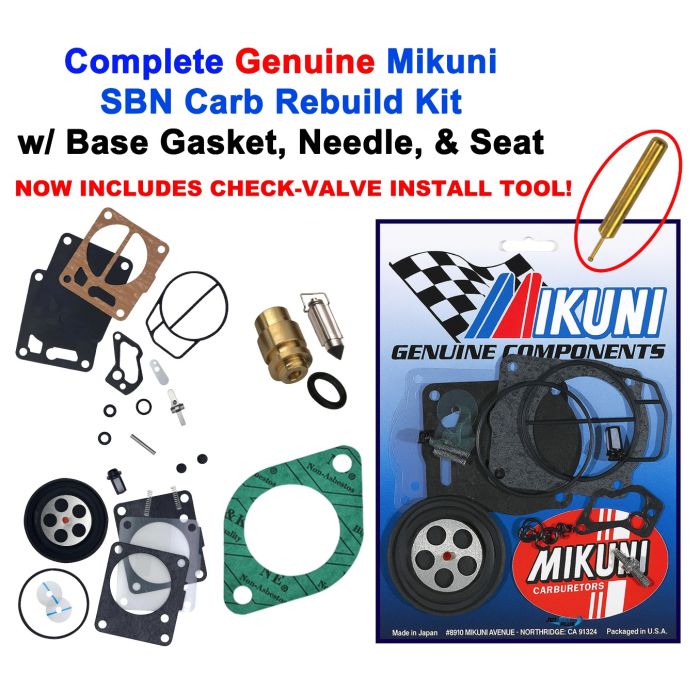 Genuine Mikuni complete SBN carburetor rebuild kit with premium aftermarket needle and seats, and the check valve installation tool.