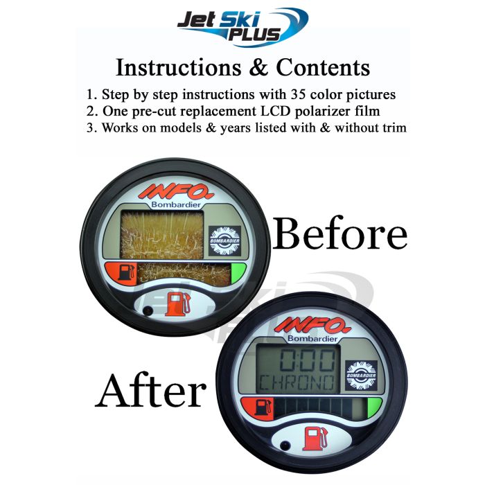 This type of UV damage causes some displays to appear wrinkled or very dark. The “before” picture of the info gauge is an example of how UV deteriorated gauge appears. The gauge simply needs the polarizer film replaced to work. Works With: This kit will work on all 1996 and newer SeaDoo LCD info gauges as listed below: