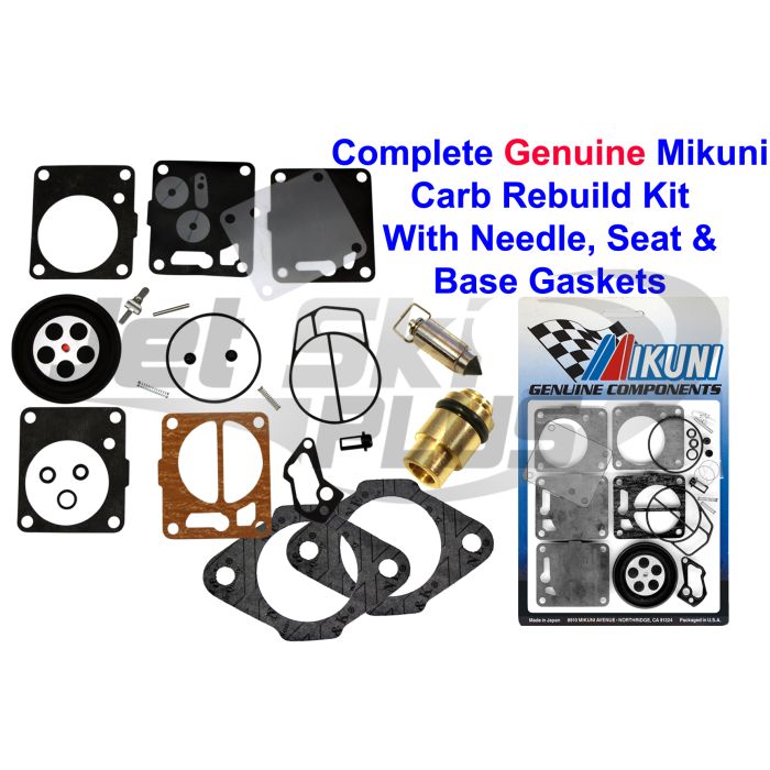 Complete Genuine Mikuni SBNI carburetor rebuild kit with Genuine Mikuni needle & seat and aftermarket base gaskets.