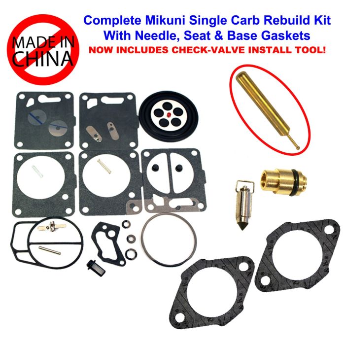 Complete aftermarket Mikuni SBNI carburetor rebuild kit with needle, seat, and base gaskets.