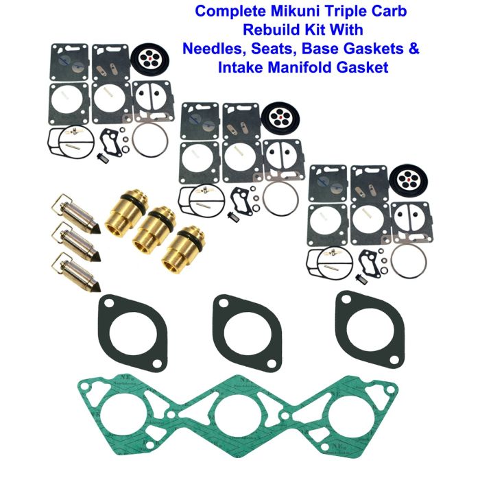 Kit includes everything pictured to rebuild 3 (THREE) carburetors along with all the needed base gaskets.