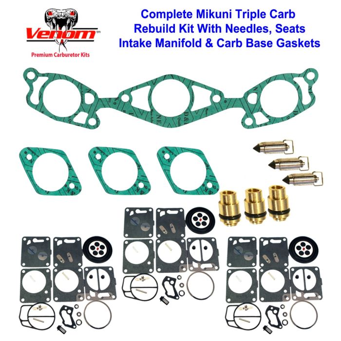 Complete Venom Brand aftermarket SBN Mikuni carburetor rebuild kit with needles and seats.